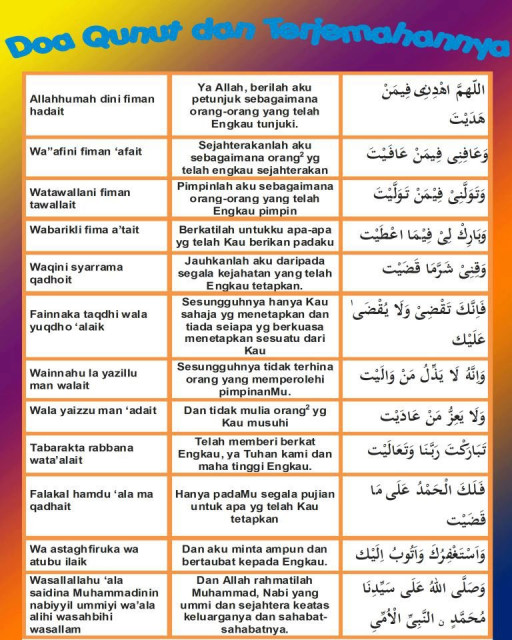 In shafi, there are three kinds of qunut namely qunut ratib (plural, rawatib), qunut witir. Doa di atas adalah lafadz doa yang diajarkan rasulullah ketika shalat witir. Pertama, doa qunut nazilah, yaitu doa yang dibacakan setelah ruku’ (i’tidal) pada.